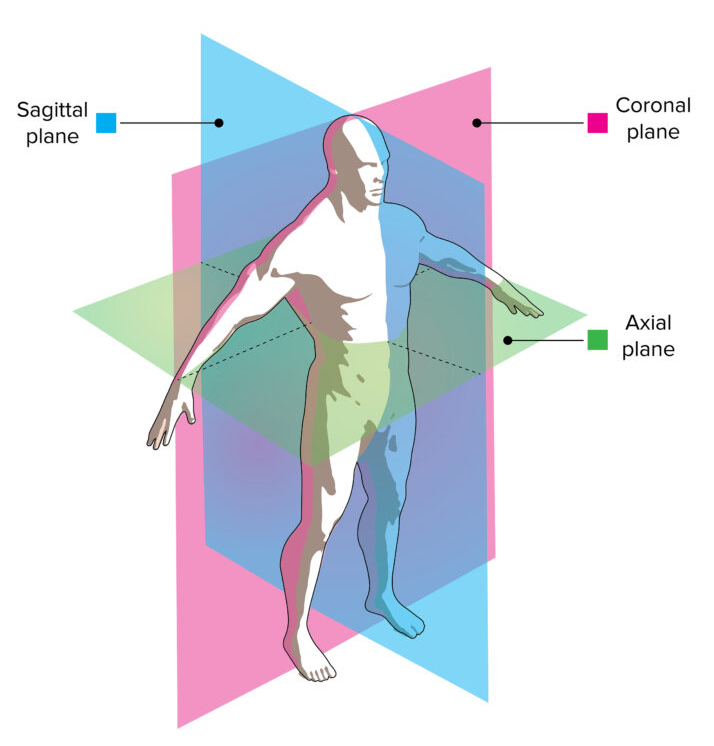 - Die Transversalebene teilt den Körper in eine obere und eine untere Hälfte für Rotationsbewegungen wie eine Drehbewegung oder einen Holzspalt.